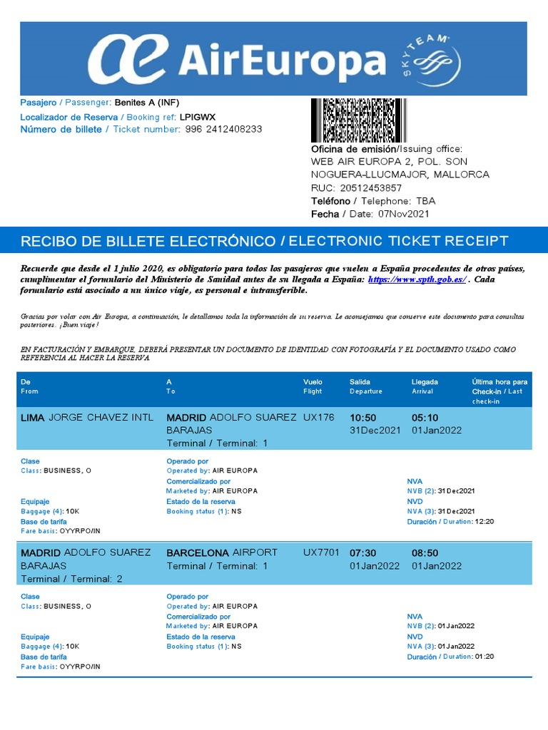 Gracias por volar con Air Europa, a continuación, le detallamos toda la información de su reserva. Le aconsejamos que conserve este documento para consultas