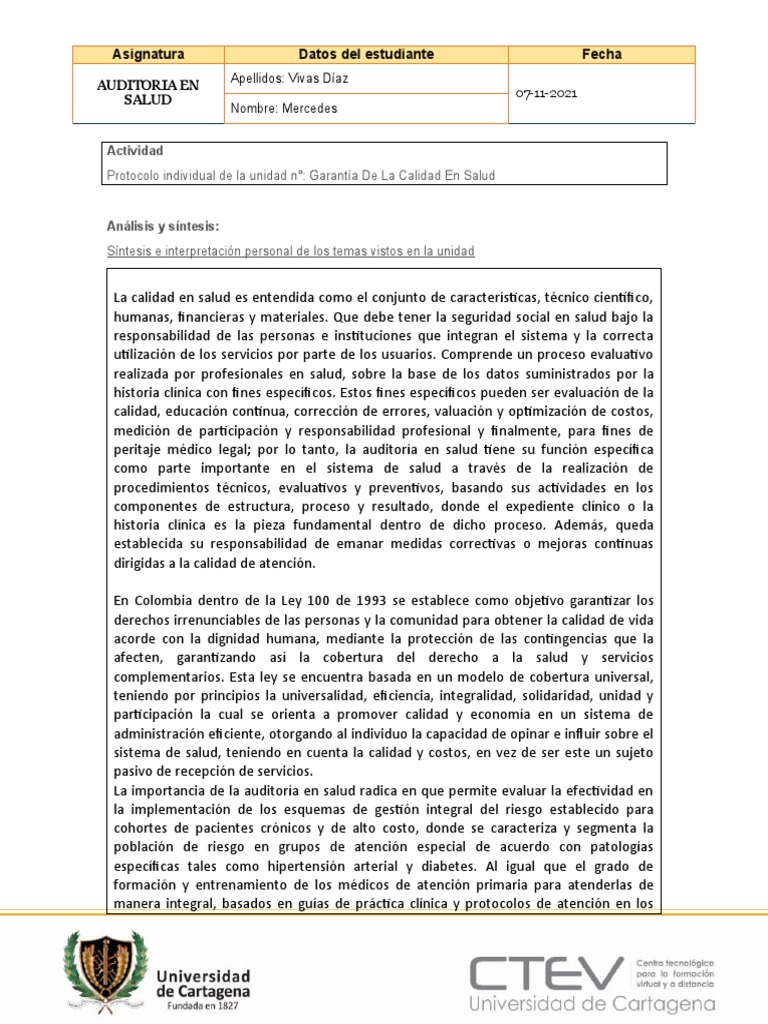 Protocolo individual de la unidad n°: Garantía De La Calidad En Salud