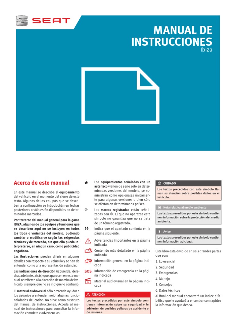 nalidades del coche. No sirve como sustituto Los textos precedidos por este símbolo con- bético que le ayudará a encontrar con rapidez No está permitida la reimpresión, la reproducción o la traducción, total o parcial, sin la autorización escrita de SEAT.