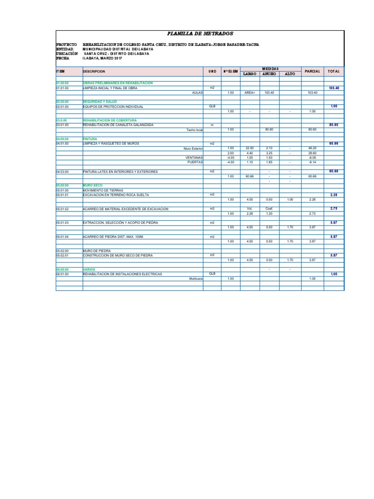 ITEM DESCRIPCION UND Nº ELEM PARCIAL TOTAL