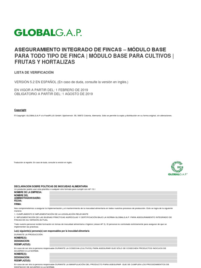 © Copyright: GLOBALG.A.P c/o FoodPLUS GmbH: Spichernstr. 55, 50672 Colonia, Alemania. Sólo se permite la copia y distribución en su forma original, sin alteraciones.