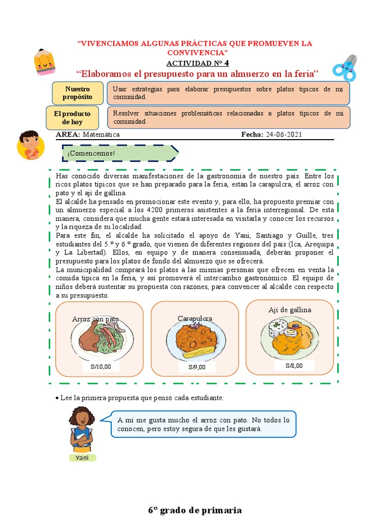El producto Resolver situaciones problemáticas relacionadas a platos típicos de mi