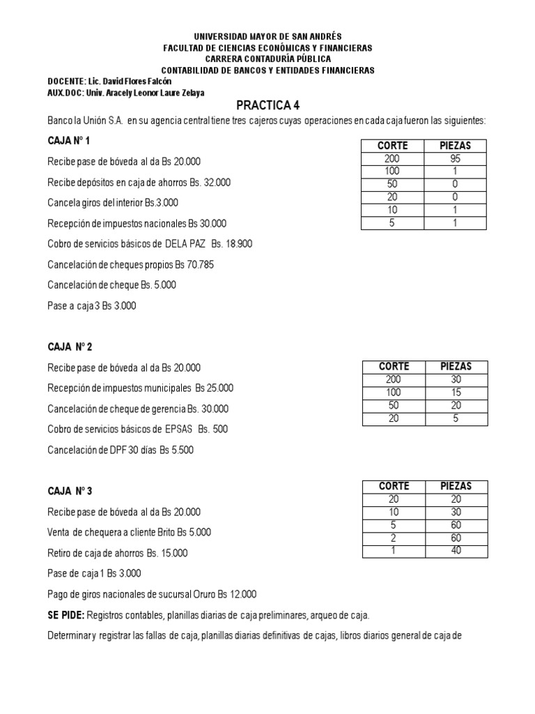 Banco la Unión S.A. en su agencia central tiene tres cajeros cuyas operaciones en cada caja fueron las siguientes: