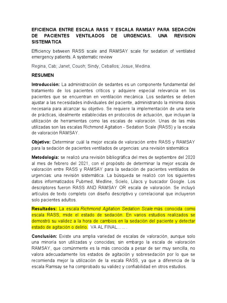 Palabras claves: Escala de valoración Ramsay, escala de valoración Rass,