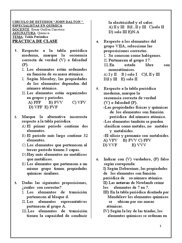 7. Respecto a la tabla periódica actual, D) II, IV E) Todas