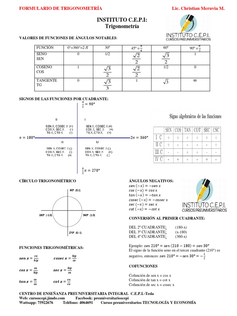 FORMULARIO DE TRIGONOMETRÍA Lic. Christian Meruvia M.