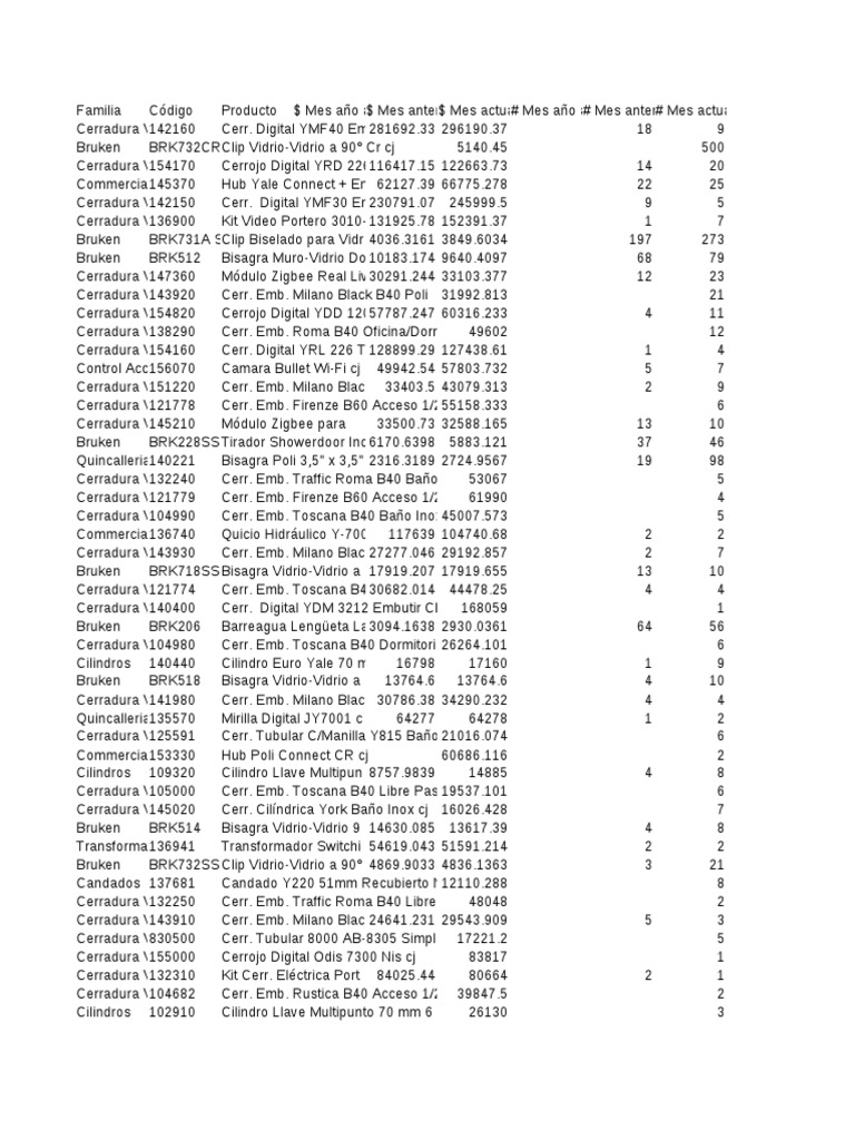 Familia Código Producto $ Mes año a$ Mes anter$ Mes actua# Mes año a# Mes anter# Mes actua