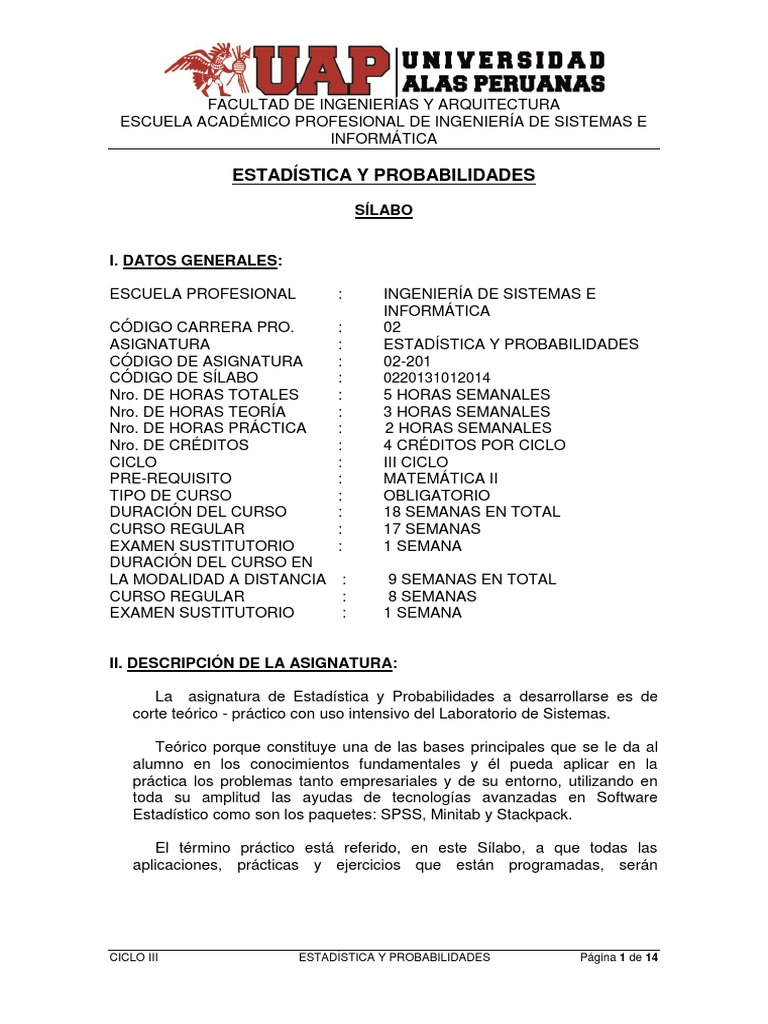 La asignatura de Estadística y Probabilidades a desarrollarse es de