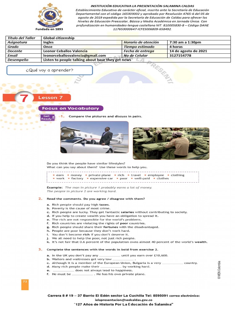 Asignatura Ingles Horario de atención 7:30 am a 1:30pm