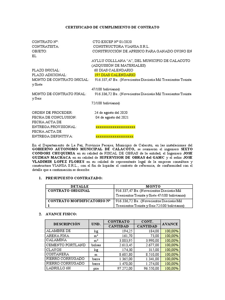 presente CERTIFICADO DE CUMPLIMIENTO DE CONTRATO y dejamos las siguientes