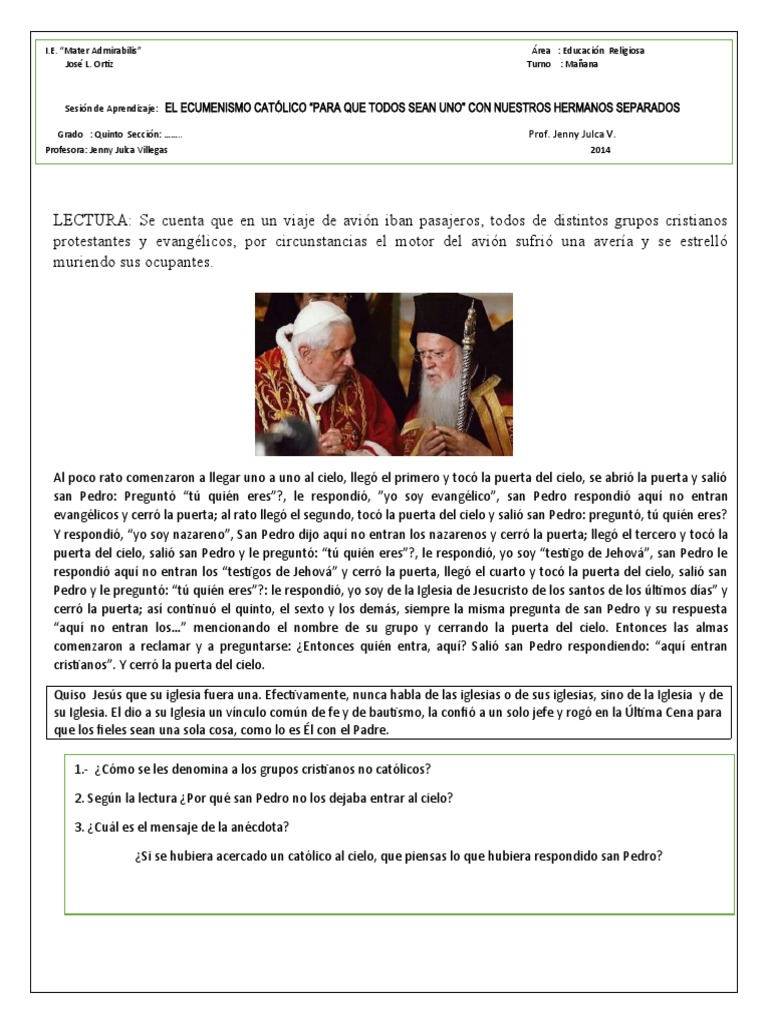 Sesión de Aprendizaje: EL ECUMENISMO CATÓLICO “PARA QUE TODOS SEAN UNO” CON NUESTROS HERMANOS SEPARADOS