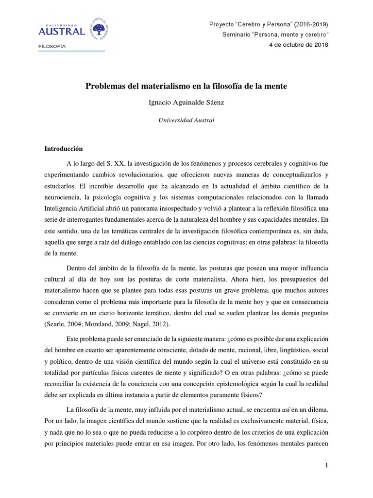 La filosofía de la mente, muy influida por el materialismo actual, se encuentra así en un dilema.