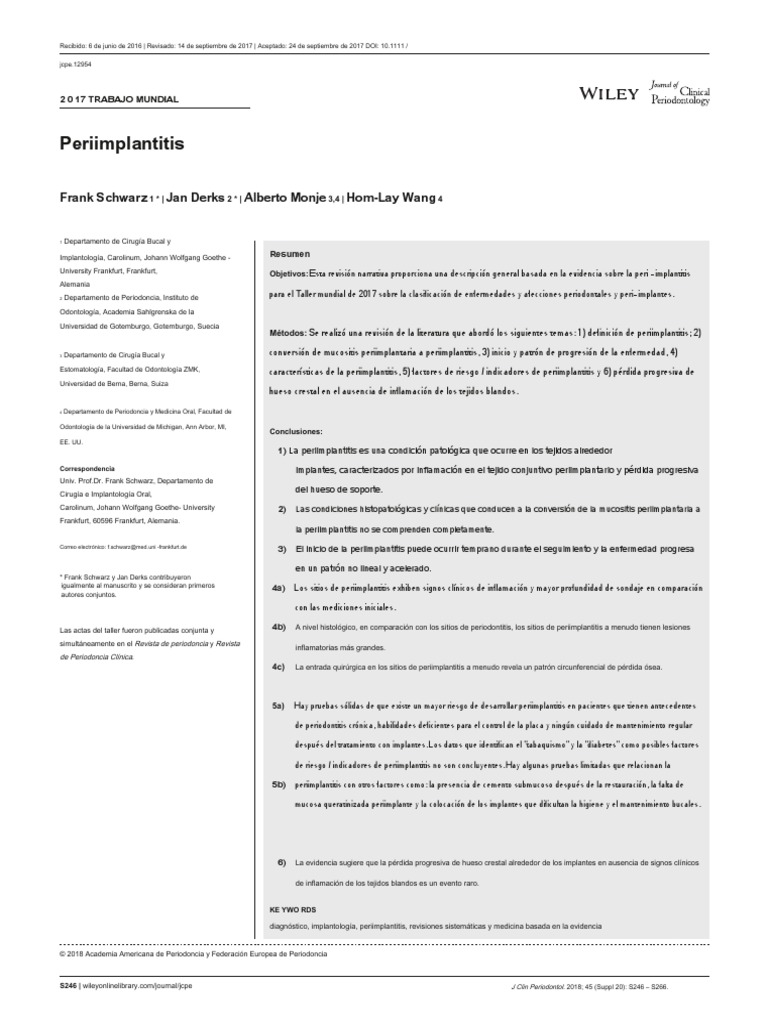 enfermedad periimplantaria: una revisión sistemática. Clin Oral Implants Res. 2017; 28: 1278-1290. actual y reporte de caso. J Periodontol. 2009; 80: 700–704. Trisi P, BerardiniM, FalcoA,