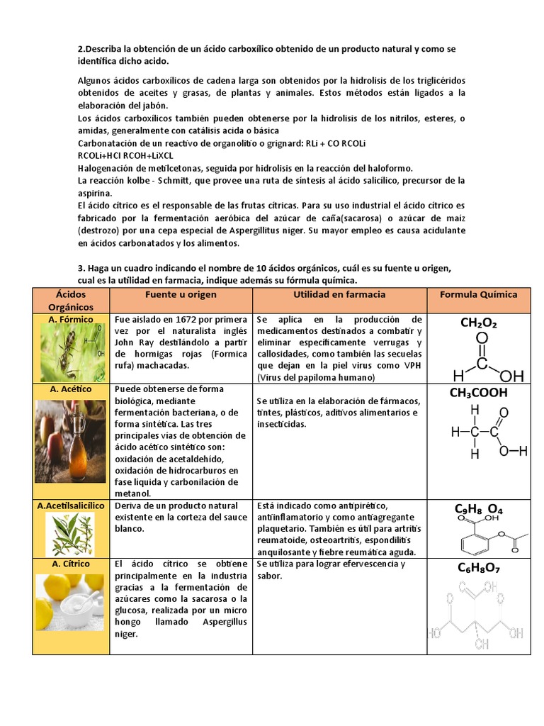 3. Haga un cuadro indicando el nombre de 10 ácidos orgánicos, cuál es su fuente u origen,