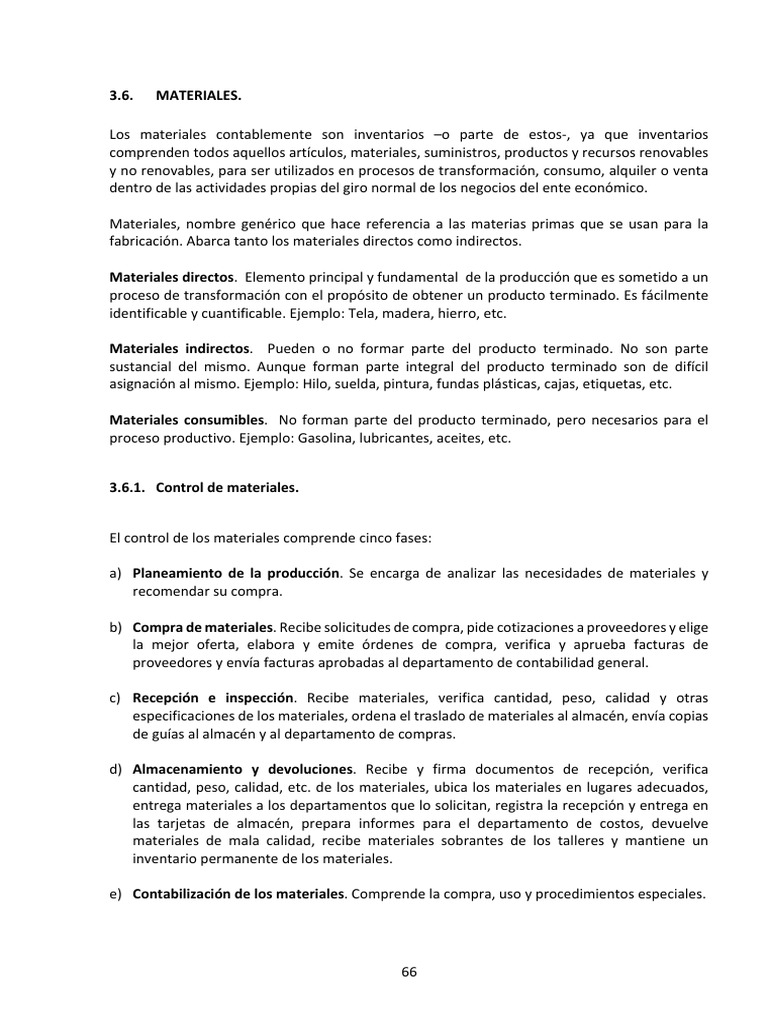 e) Contabilización de los materiales. Comprende la compra, uso y procedimientos especiales.