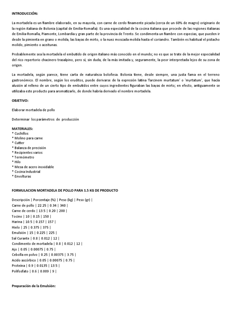 FORMULACION MORTADELA DE POLLO PARA 1.5 KG DE PRODUCTO
