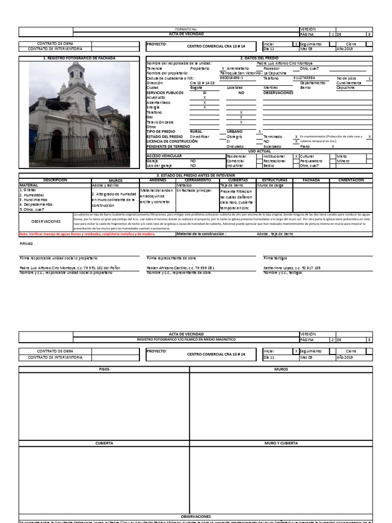 Nombre y c.c., responsable unidad social o propietario Nombre y c.c., representante de obra Nombre y c.c., testigos