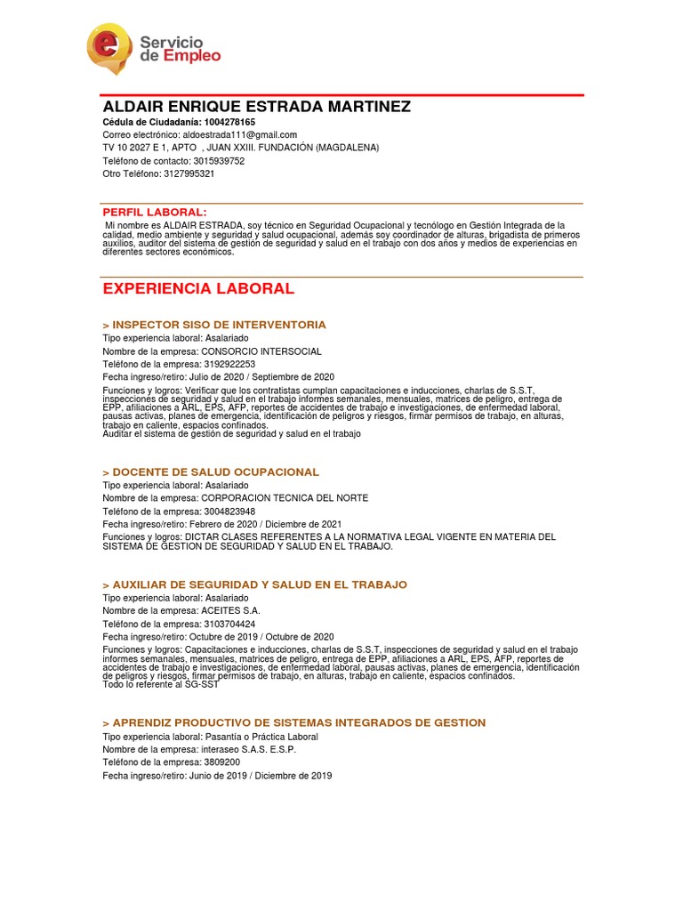 Mi nombre es ALDAIR ESTRADA, soy técnico en Seguridad Ocupacional y tecnólogo en Gestión Integrada de la