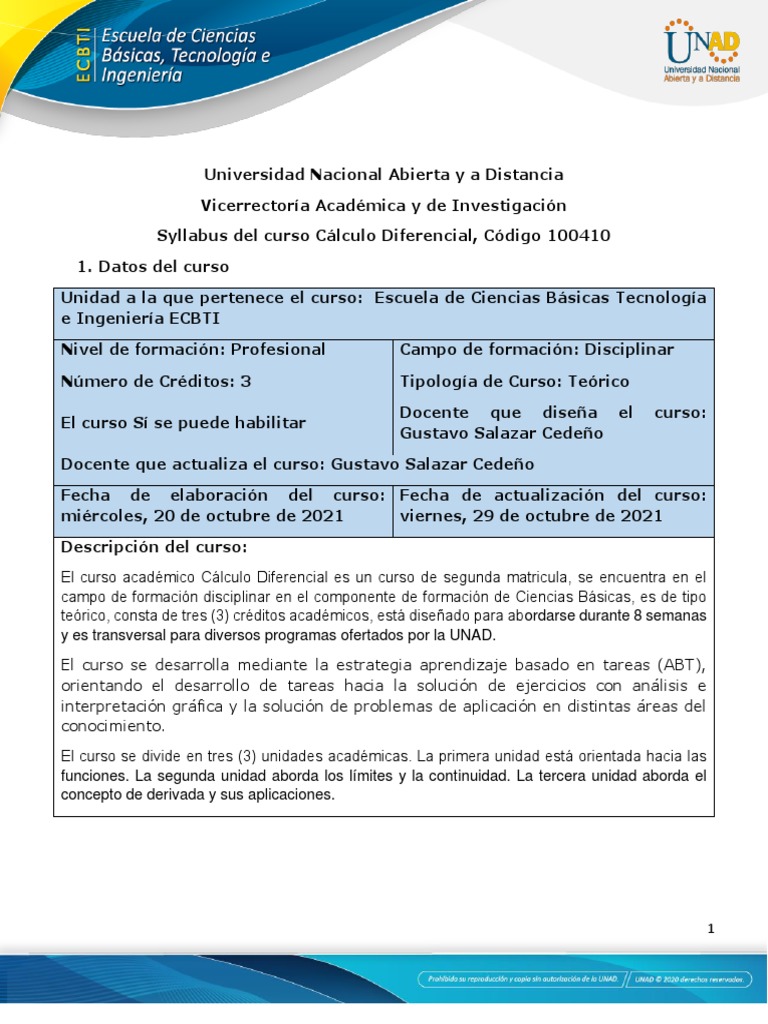 Syllabus del curso Cálculo Diferencial, Código 100410