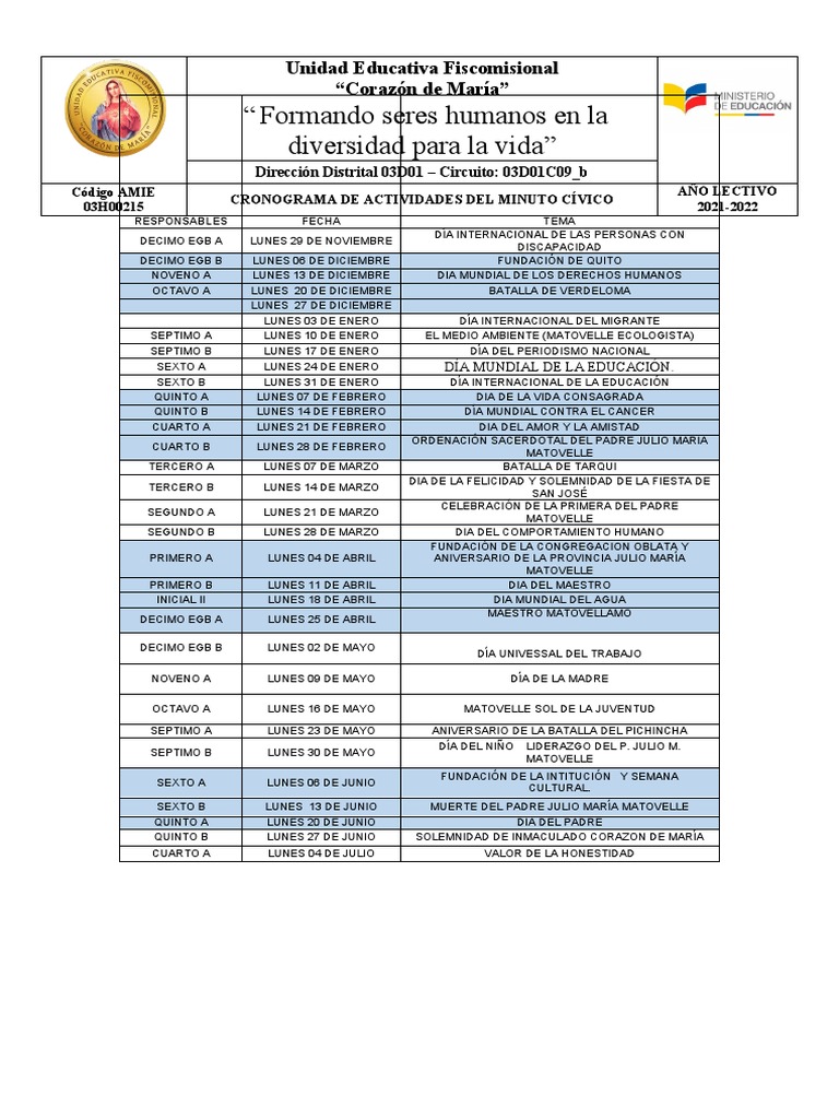 CRONOGRAMA DE ACTIVIDADES DEL MINUTO CÍVICO