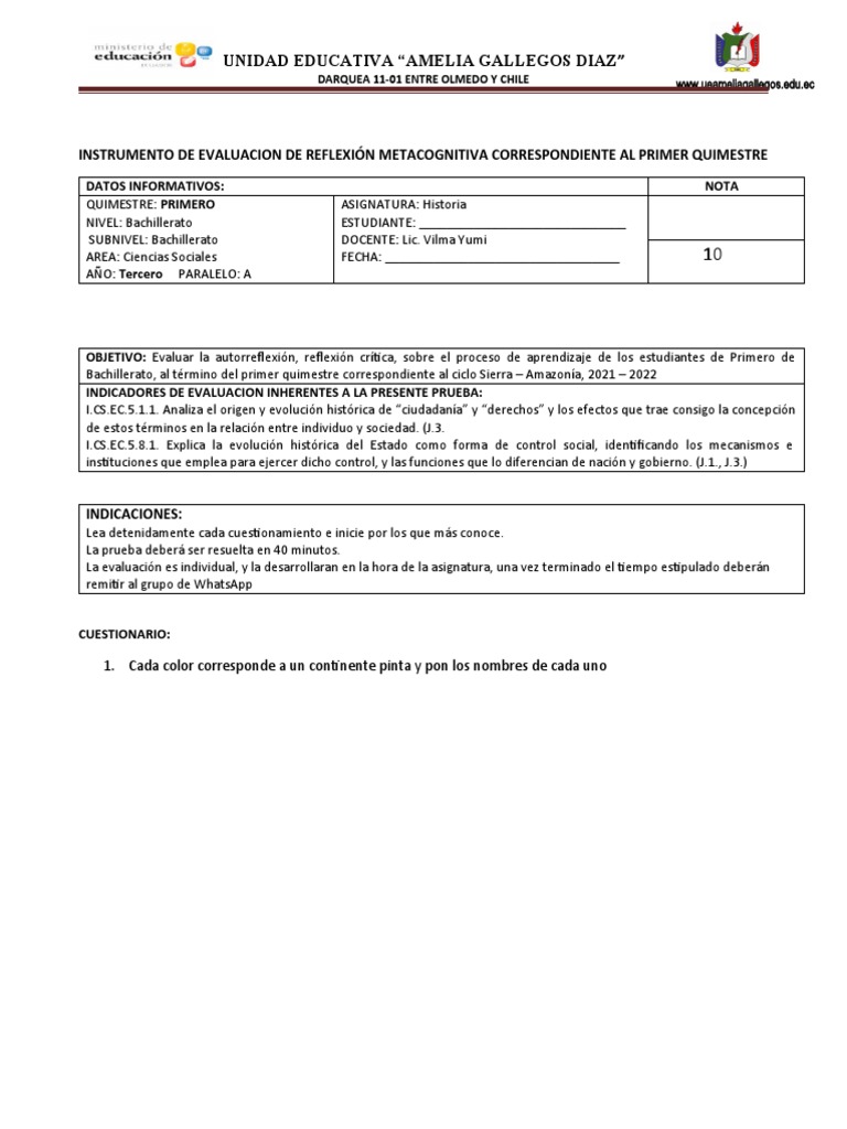 INSTRUMENTO DE EVALUACION DE REFLEXIÓN METACOGNITIVA CORRESPONDIENTE AL PRIMER QUIMESTRE