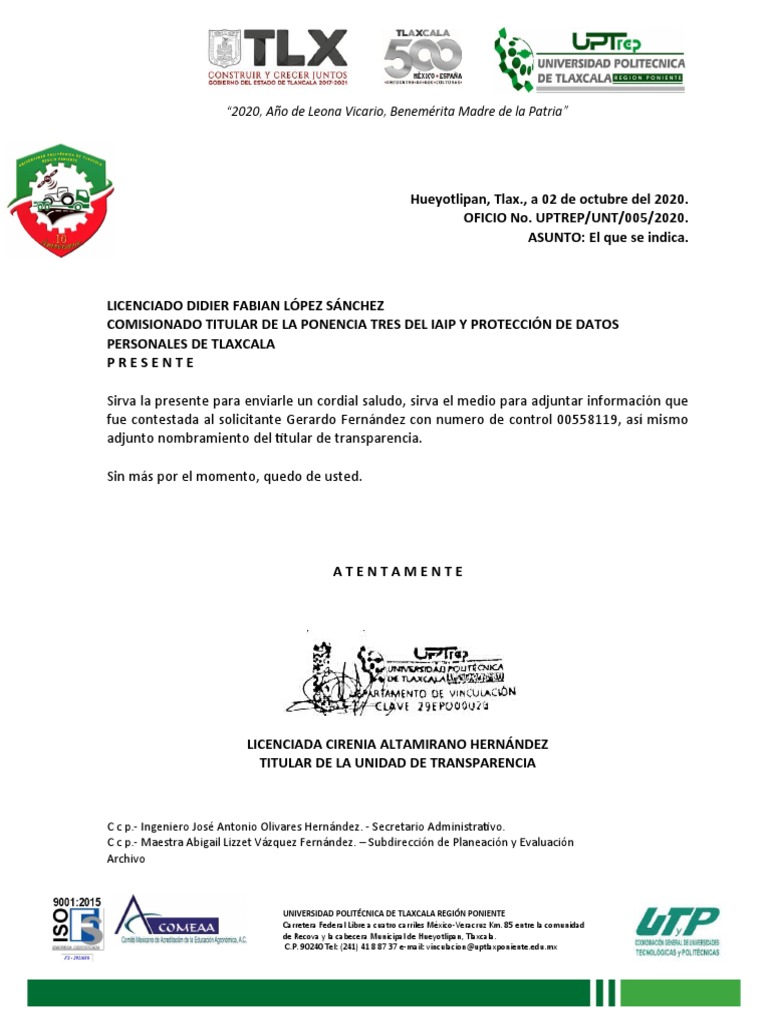 OFICIO No. UPTREP/UNT/005/2020.