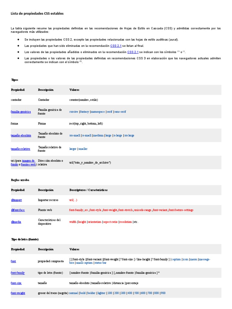 Lista de propiedades CSS estables