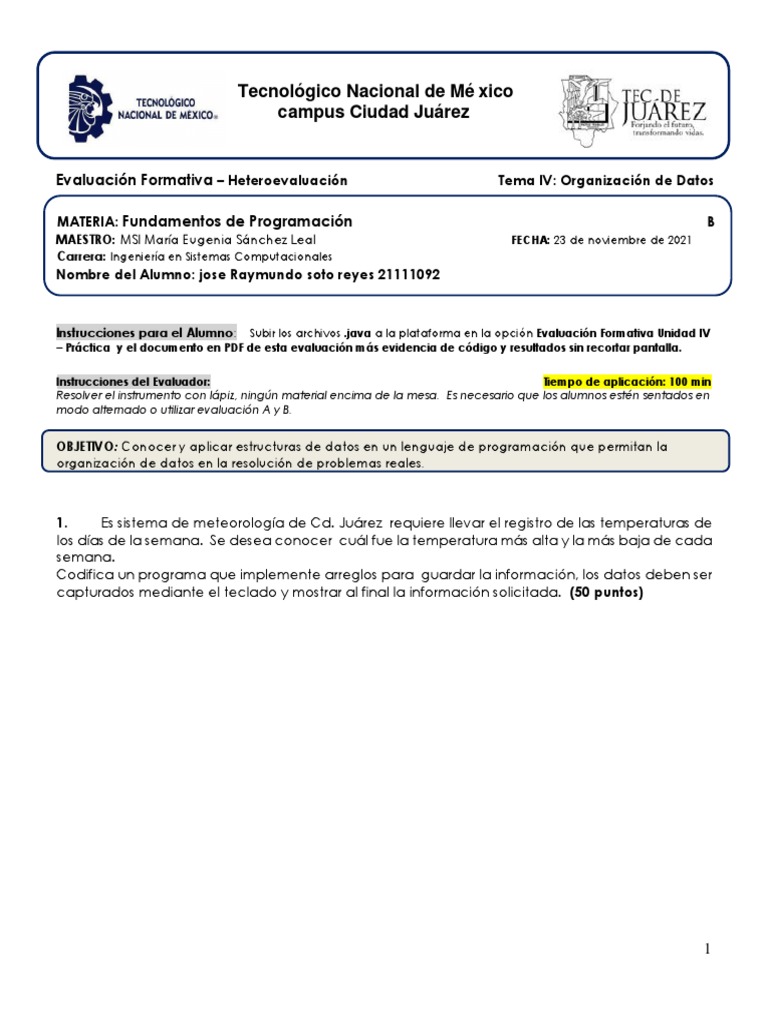 Instrucciones del Evaluador: Tiempo de aplicación: 100 min
