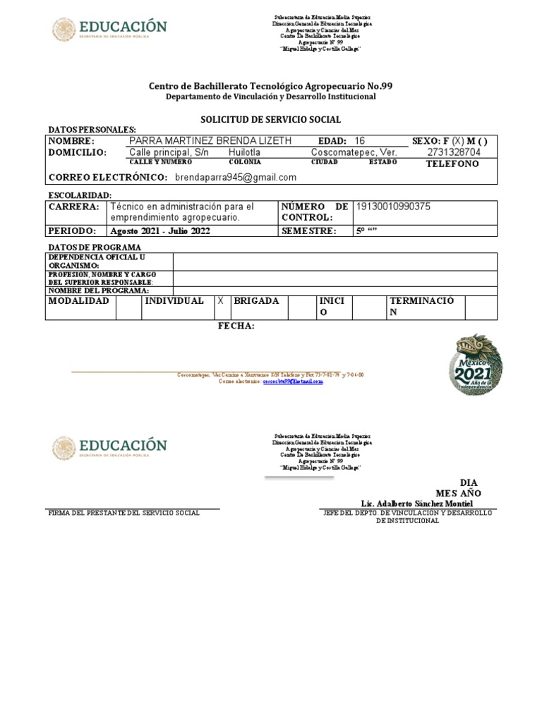 NOMBRE: PARRA MARTINEZ BRENDA LIZETH EDAD: 16 SEXO: F (X) M ( )