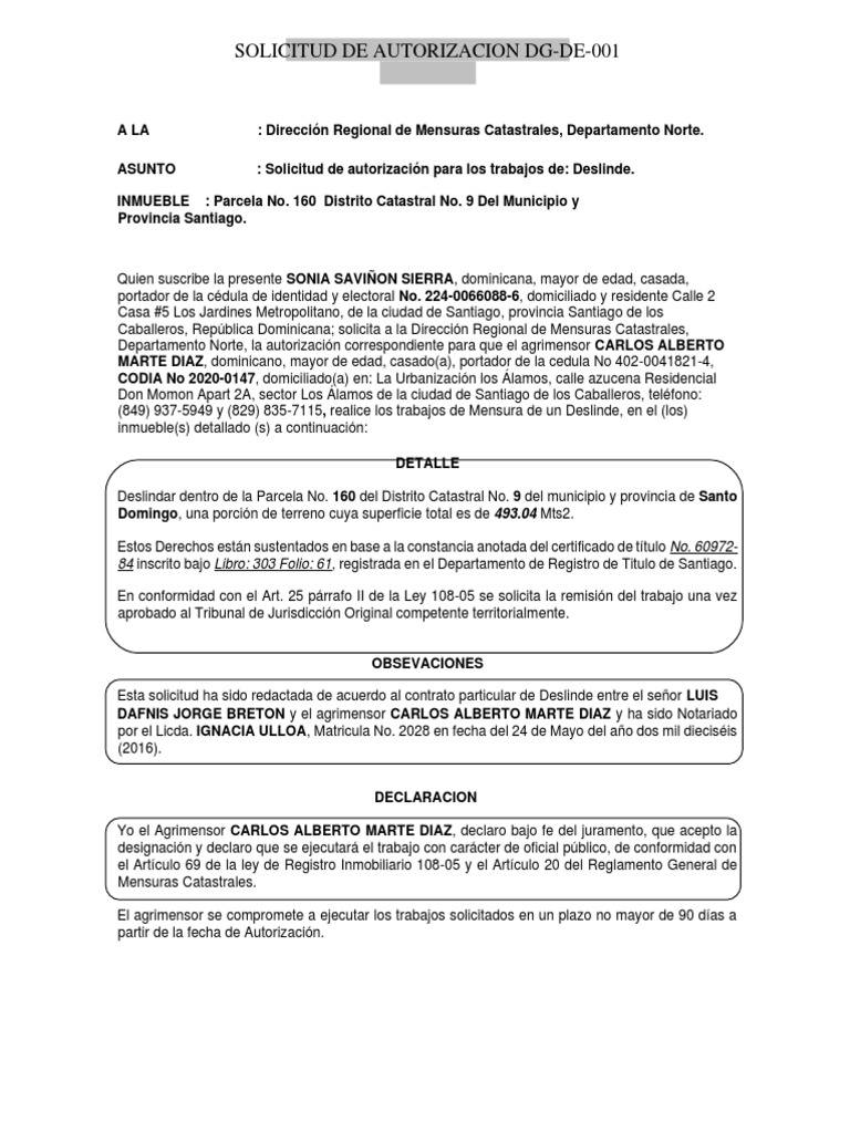 Esta solicitud ha sido redactada de acuerdo al contrato particular de Deslinde entre el señor LUIS