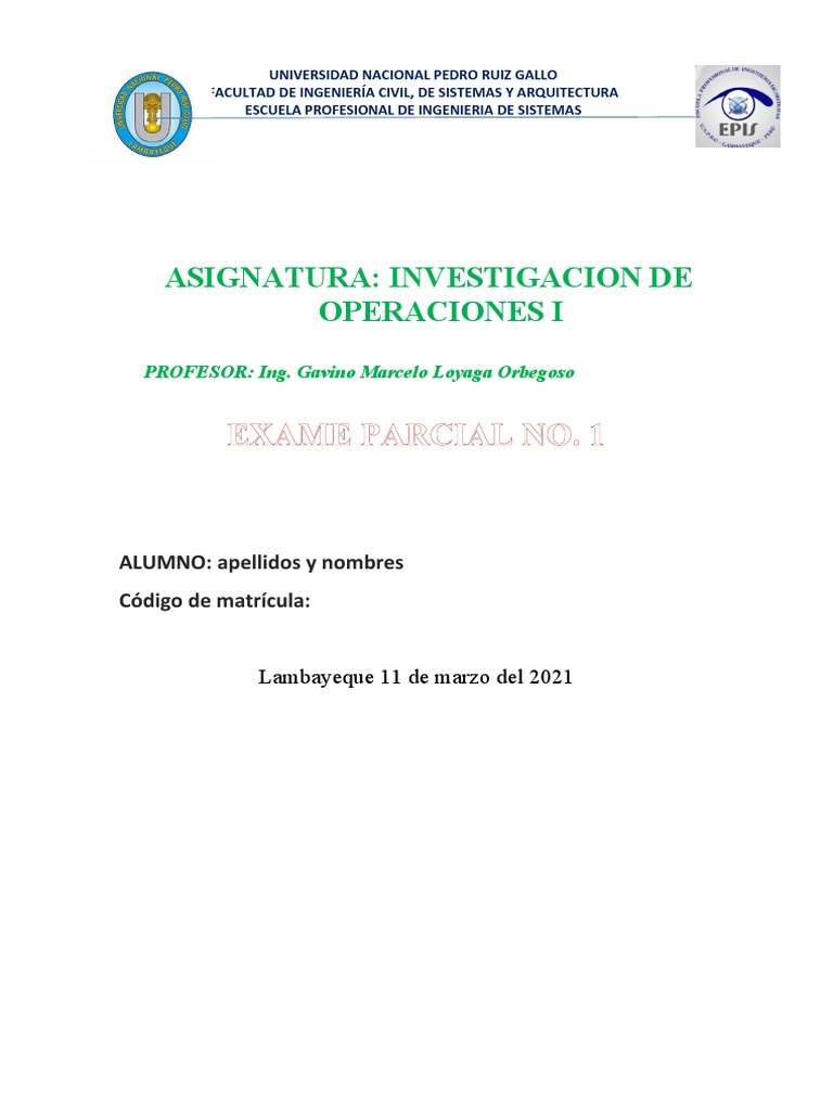Investigación de Operaciones I Examen Parcial No. 1