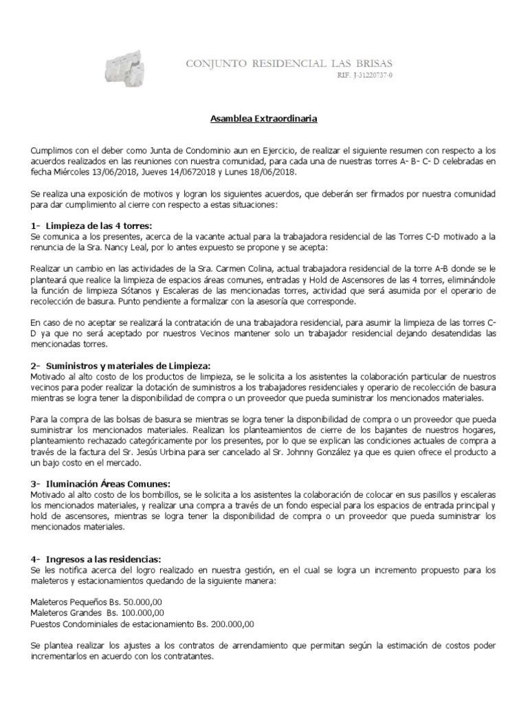 acuerdos realizados en las reuniones con nuestra comunidad, para cada una de nuestras torres A- B- C- D celebradas en