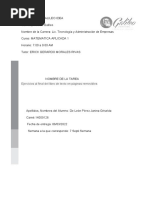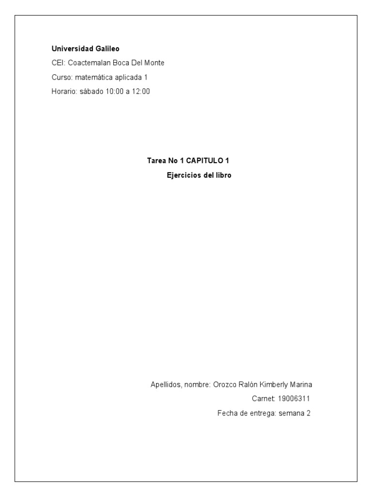 Este documento contiene información sobre una tarea de matemáticas aplicadas para la Universidad Galileo. La tarea corresponde al Capítulo 1 del libro y debe ser entregada por la estudiante Kimberly Marina Orozco Ralón, con carnet 19006311, durante la segunda semana del curso que se imparte los sábados de 10:00 a 12:00 en la CEI de Boca del Monte.