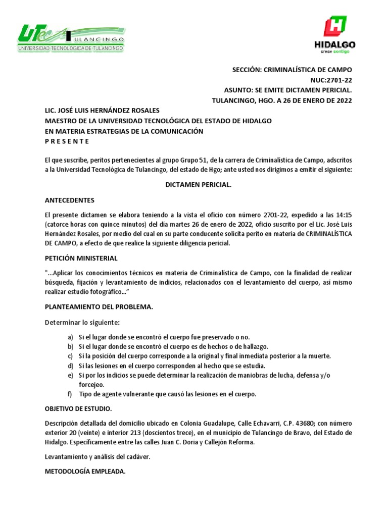 El que suscribe, peritos pertenecientes al grupo Grupo 51, de la carrera de Criminalística de Campo, adscritos