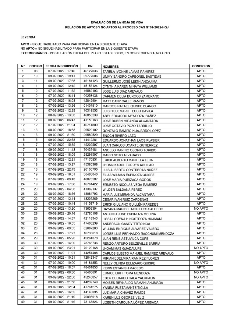 RELACIÓN DE APTOS Y NO APTOS AL PROCESO CAS N° 01-2022-HGJ