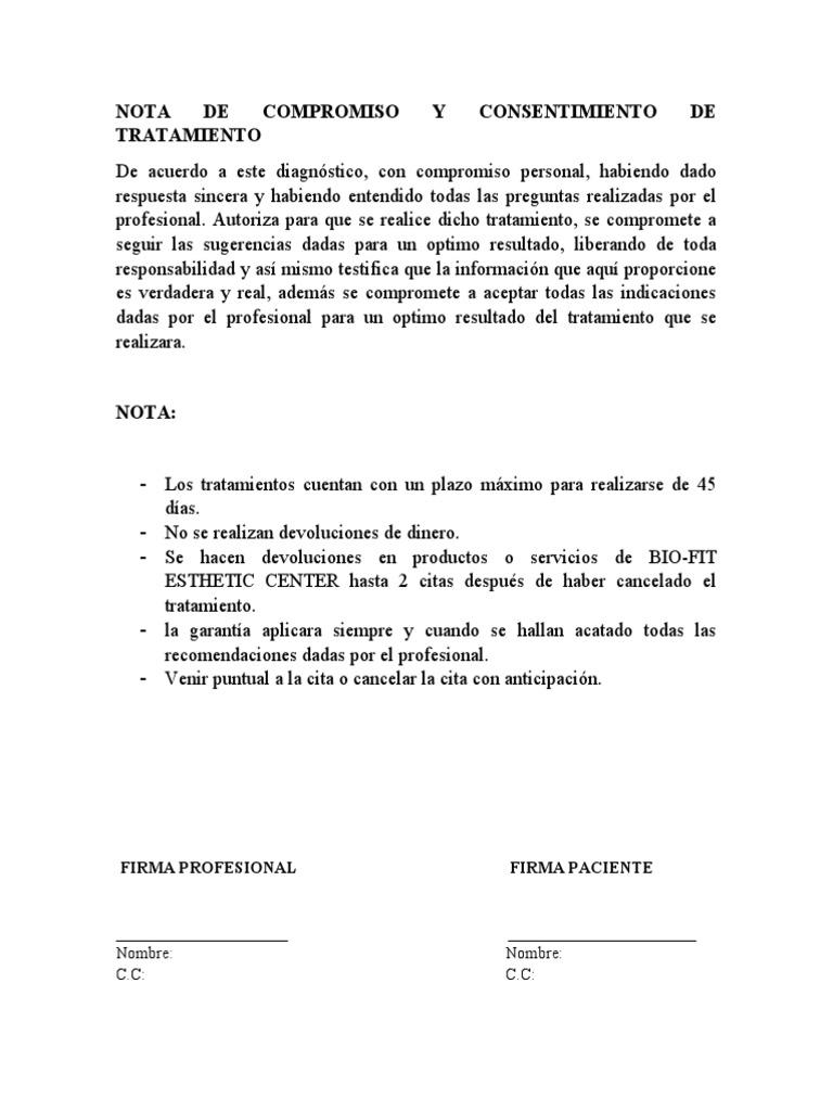 profesional. Autoriza para que se realice dicho tratamiento, se compromete a