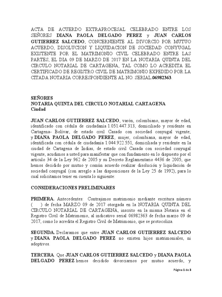 TERCERA. Que JUAN CARLOS GUTIERREZ SALCEDO y DIANA PAOLA