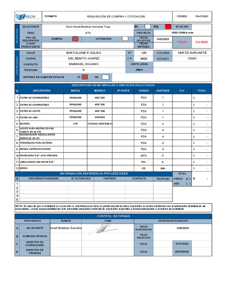 FORMATO REQUISICIÓN DE COMPRA Y COTIZACIÓN CÓDIGO FA-CPS-01