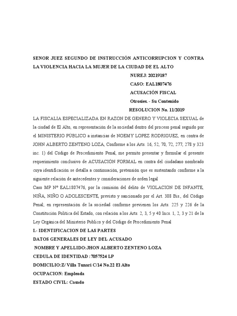 a bien presentar ACUSACION en contra de JHON ALBERTO ZENTENO LOZA POR EL