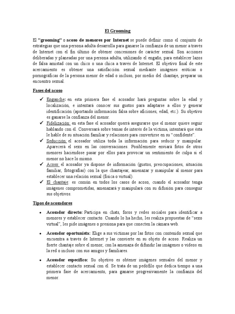 El "grooming" o acoso de menores por Internet se puede definir como el conjunto de