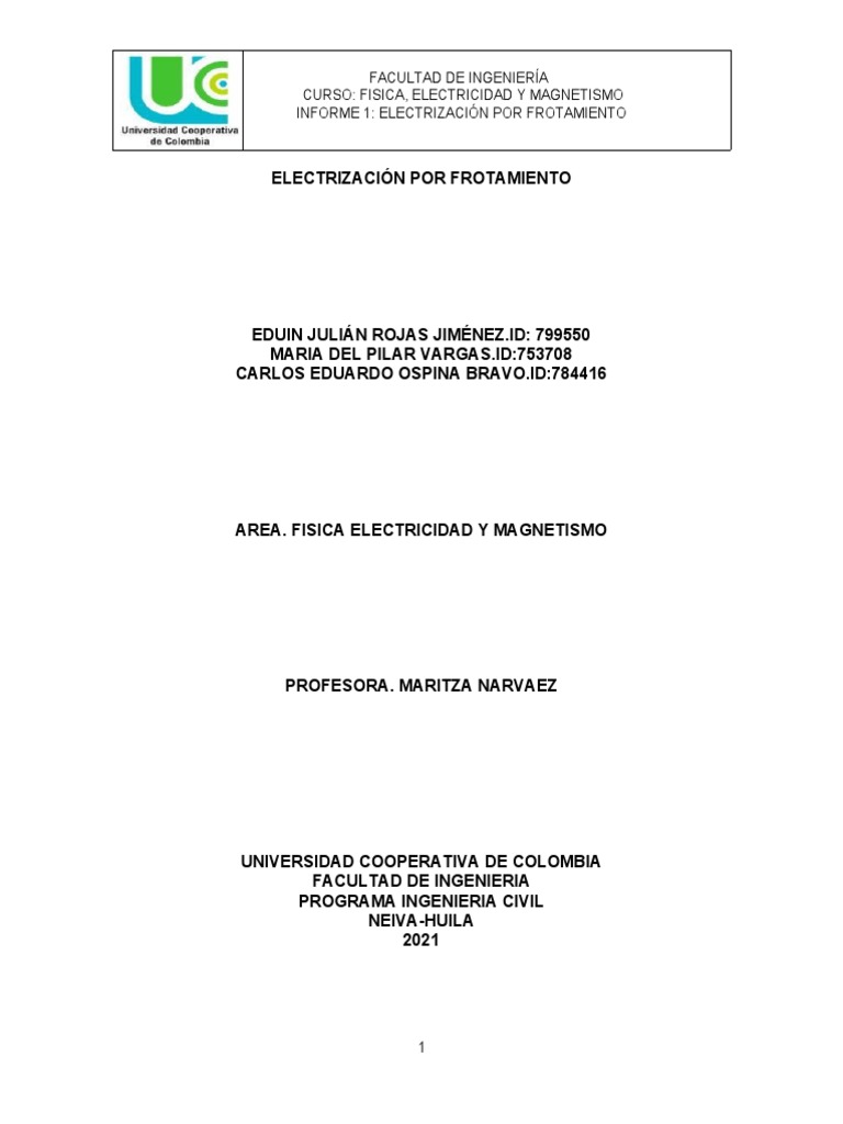 INFORME 1: ELECTRIZACIÓN POR FROTAMIENTO