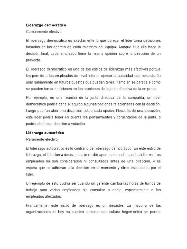 y considerar los aportes de los empleados, a diferencia del liderazgo autocrático,