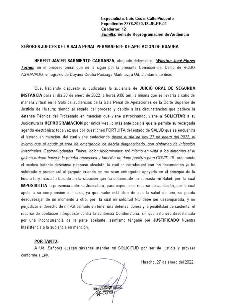 HEBERT JAVIER SARMIENTO CARRANZA, abogado defensor de Winston José Flores