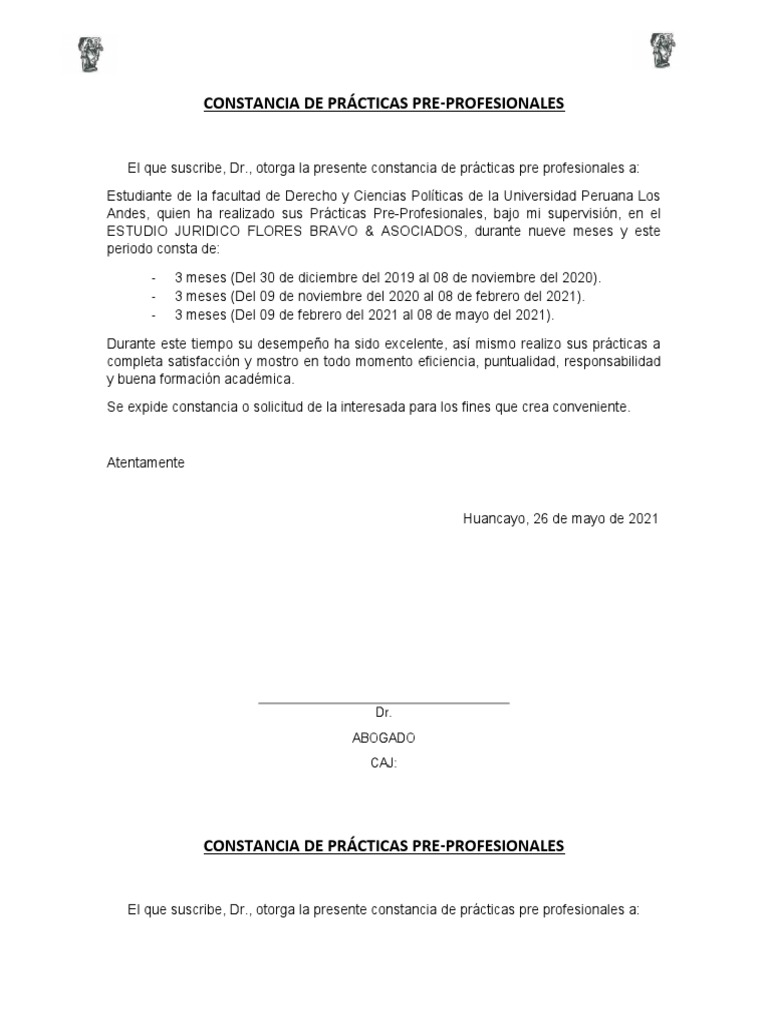 El que suscribe, Dr., otorga la presente constancia de prácticas pre profesionales a: