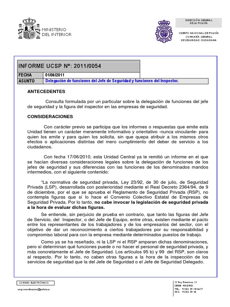 ASUNTO Delegación de funciones del Jefe de Seguridad y funciones del Inspector.