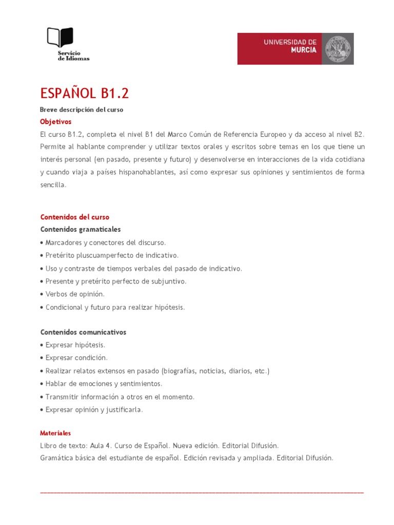 El curso B1.2, completa el nivel B1 del Marco Común de Referencia Europeo y da acceso al nivel B2.