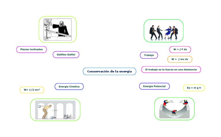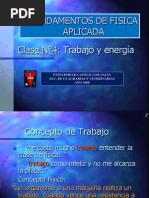 El documento aborda conceptos fundamentales de la física, incluyendo el trabajo, la energía cinética y la energía potencial. Se presentan fórmulas clave como W = ∫ F dx para el trabajo y Ep = m g h para la energía potencial. Además, se menciona la conservación de la energía y se relaciona el trabajo con la fuerza aplicada a lo largo de una distancia.