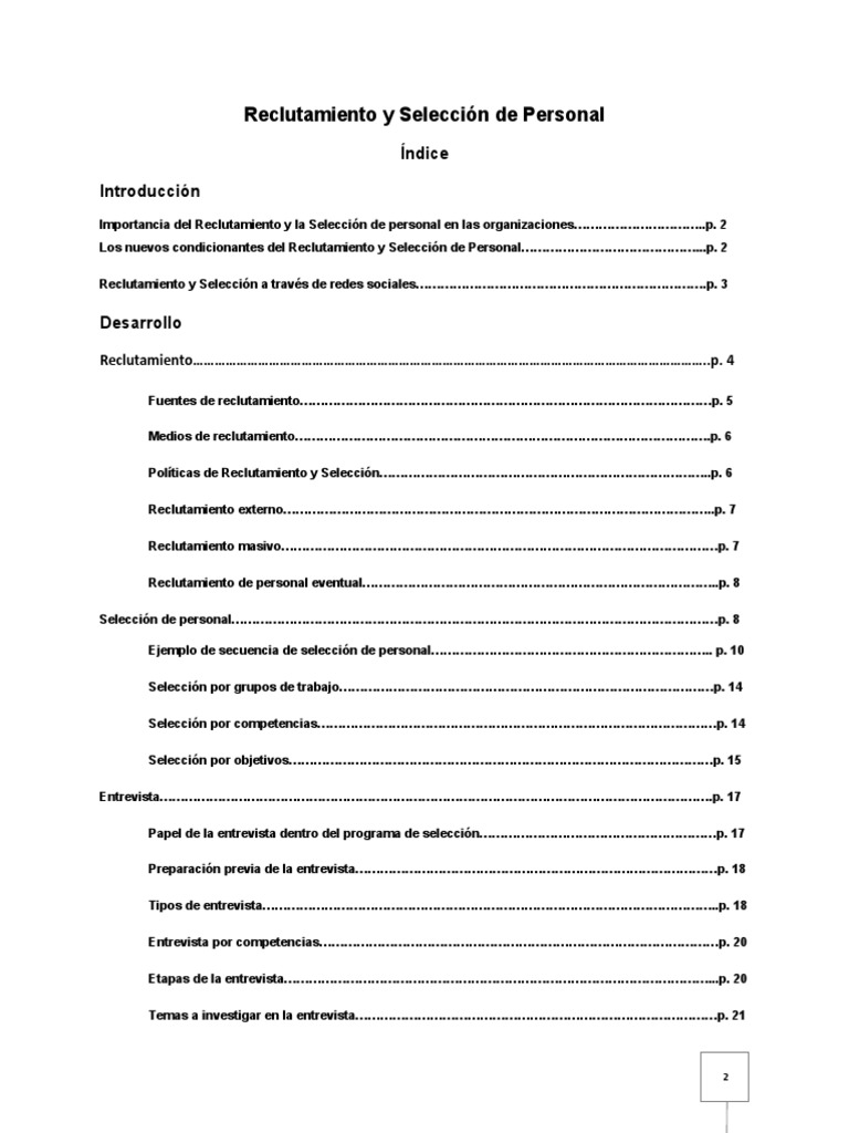 Importancia del Reclutamiento y la Selección de personal en las organizaciones…………………………..p. 2