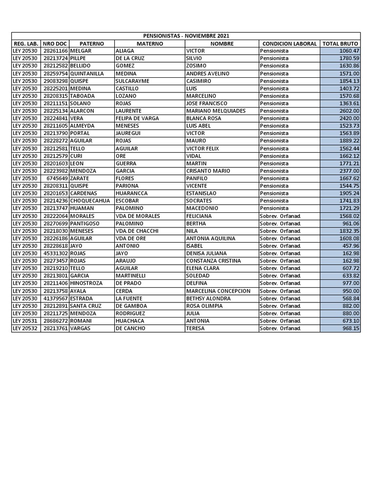 REG. LAB. NRO DOC PATERNO MATERNO NOMBRE CONDICION LABORAL TOTAL BRUTO