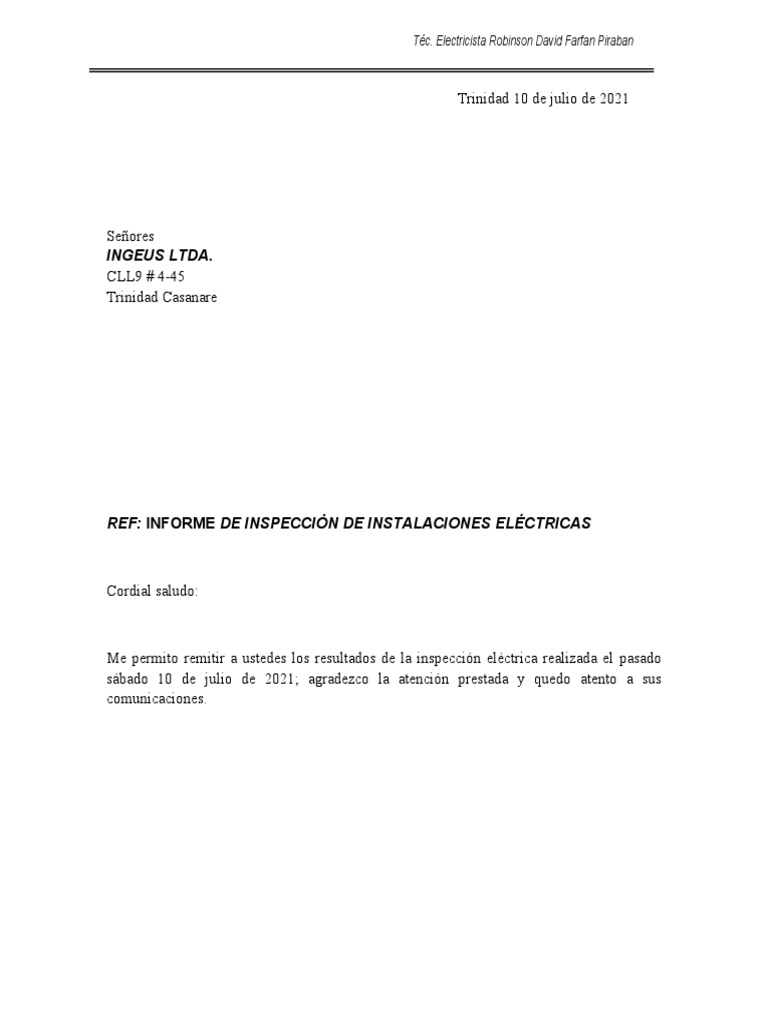 Me permito remitir a ustedes los resultados de la inspección eléctrica realizada el pasado